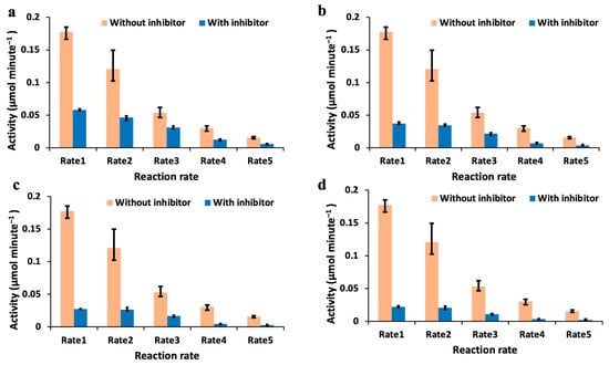 The activity calculated from the enzyme kinetics monitored over time by the 3D-printed spectrophotometer is shown here. This activity measured under the influence of different volume concentrations of the inhibitor is compared with the activity measured without any inhibitor at different reaction kinetics rates. (a) The activity for volume concentration A of the inhibitor is compared with the activity without any inhibition at different kinetics rates, including the error bars. (b) The activity for volume concentration B of the inhibitor used is compared with the activity without any inhibition at different kinetics rates. (c) The activity for volume concentration C of the inhibitor used is compared with the activity measured without any inhibition at different kinetics rates. (d) The activity for volume concentration D of the inhibitor used is compared with the activity measured without any inhibition at different kinetics rates.