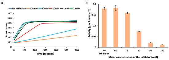 The effect of the molar concentration of the inhibitor on the enzyme kinetics at reaction Rate1 is shown in this figure. (a) Enzyme kinetics monitored over time at Rate1 under the influence of the inhibitor at different molar concentrations. (b) Activity calculated with and without an inhibitor (at different molar concentrations) for the fixed volume concentration is shown with error bars.