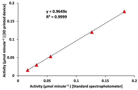 The correlation between the enzyme activity measured using the 3D-printed spectrophotometer and the control instrument is shown in Figure 7. Enzyme activity was calculated at each of the reaction rates mentioned above without an inhibitor. In a comparative analysis between measurements obtained from 3D-printed and laboratory spectrophotometers, the correlation coefficient is obtained to be 0.9999, indicating an excellent linear fit. This proves the performance of the portable 3D-printed spectrophotometer to be comparable with the control laboratory instrument and can easily be used as an alternate for applications where these laboratory instruments are inconvenient to use.