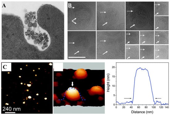 To reveal the morphology of the single EV, transmission electron microscopy (TEM) [], cryo-EM [] as well as atomic force microscopy (AFM) [] have been widely used to observe EVs in different conditions. In fact, it was in the 1960s [] that EVs were first-time observed under an EM when they were described as “platelet dust”. In the 1980s, Pan et al. [,] described EVs as small dense bodies observed under TEM with a size of 50 nm (Figure 1A) and demonstrated that the transferrin receptor was externalized in these vesicles. EVs exhibit a saucer-like structure under TEM caused by the collapse of the samples during sample drying treatment, while cryo-EM can completely preserve their original morphology, as they were imaged in their native aqueous status without fixation. In addition, cryo-EM enables the precise observation of the EV morphology and heterogeneity []. Poliakov et al. [] reported the detailed structures of small exosome-like vesicles isolated from human seminal fluid for the first time (Figure 1B). They analyzed 301 cryo-EM images of vesicles purified by a sucrose gradient, and described their morphological characteristics in detail, including multiplicity, shape, external features and the overall density of the vesicles.