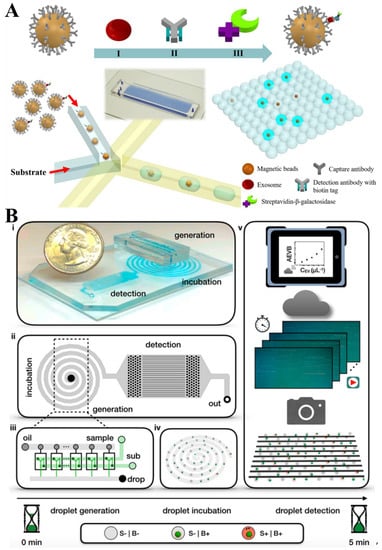 Lately, droplet technology [] has been used for the counting of single EVs, showing a dramatic improvement in the detection sensitivity. Liu et al. [] reported an immunosorbent test for the digital validation of the target EVs (Figure 4A). Briefly, EVs were first captured on the magnetic beads and labeled with a reporter which generates a fluorescent signal. These beads were then encapsulated separately into droplets with just one bead enclosed in each droplet. The droplet-based single-exosome-counting enzyme-linked immunoassay (droplet digital ExoELISA) achieved a limit of detection, down to 10 exosomes/μL in an absolute counting way for the single exosomes. Compared with the signal amplification method of the ELISA, the signal amplification method of DNA in an in vitro amplification, may be more stable. They successfully quantified EVs in serum samples using a droplet digital ExoELISA. Yang et al. [] developed a droplet-based extracellular vesicle analysis (DEVA) assay (Figure 4B), which enables the quantification of EV subpopulations with a high throughput of 20 million droplets per minutes, which is 100 times greater than microfluidic systems. Notably, a LOD of 9 EVs/μL was achieved when processing EVs in the PBS samples. The application of the droplet digital technology provides a completely new way that allows for the ultrasensitive EV detection.