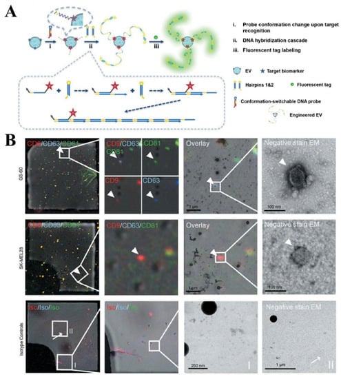 - Zhang, J.; Shi, J.; Zhang, H.; Zhu, Y.; Liu, W.; Zhang, K.; Zhang, Z. Localized fluorescent imaging of multiple proteins on individual extracellular vesicles using rolling circle amplification for cancer diagnosis. J. Extracell. Vesicles 2020, 10, 1. [Google Scholar] [CrossRef]