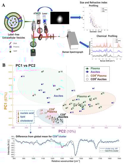 Raman-based methods for the single EV molecular analysis. (A) Raman−enabled nanoparticle trapping analysis (R−NTA) for the EV analysis, by using morphology and chemical information. Reprinted with permission from []. Copyright 2020, American Chemical Society. (B) A multispectral optical tweezers (MS−Ots) for the single vesicle molecular fingerprinting. Reprinted with permission from []. Copyright 2017, American Chemical Society.