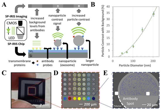 Schematic representation of the single particle interferometric imaging sensing (SP-IRIS) detection process. (A) Detection principle of SP-IRIS technique. (B) SP-IRIS signal for polystyrene nanoparticles (50–200 nm). (C) Image of a SP-IRIS chip. (D) Microarray of immobilized capture probes. (E) SP-IRIS image of a capture probe. Reprinted with permission from []. Copyright 2016, Springer Nature.