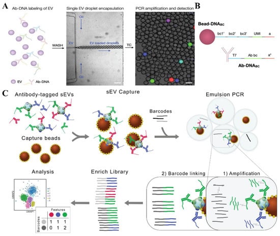 The Weissleder group [,,] exploited the application of the antibody-based immuno-droplet digital polymerase chain reaction (iddPCR) for the protein analysis on single EVs. Followed by the PCR amplification, individual droplets with target EVs in them were imaged by fluorescence microscopy for the EV quantification (Figure 9A). To specify the limitation from the fluorescence readout, they proposed an antibody-DNA barcode-based immunosequencing method (seiSEQ) []. The EVs attached with Ab-DNA are subsequently encapsulated into 70 µm droplets along with barcoded beads (Figure 9B), where the PCR amplifies the DNA barcode signals, enabling the multiplexing of the protein profile in individual EVs with a high specificity. Banijamali et al. [] further developed a droplet barcode sequencing technology to analyze multiple proteins without barcoded gel beads (Figure 9C). The droplet digital technology has also been employed to amplify and characterize single EV nucleic acids. The traditional method for the EV nucleic acid analysis requires the EV lysis, followed by the quantitative real-time PCR (qPCR) or ddPCR in a population-based analysis. Pasini et al. [] have reported that the droplet-based method enabled the detection of nucleic acid biomarkers in a single EV, which may explore more information on the specific EV subset that contains specific biomarkers.
