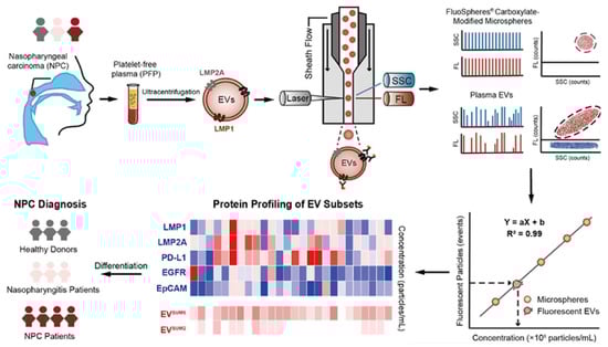 Phenotypic analysis of the plasma EVs for the detection of nasopharyngeal carcinoma. The exosome samples were isolated from plasma by ultracentrifugation. Reprinted with permission from []. Copyright 2022, American Chemical Society.