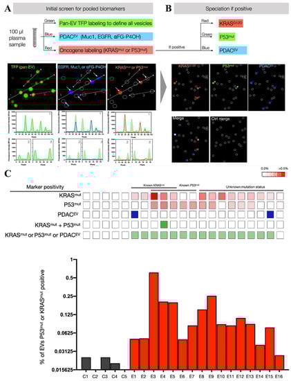 Workflow of the single EV analysis. (A) Target EVs are labeled for the pooled biomarkers. (B) A separate fluorochrome defined EV in each positive case. (C) Analysis of KRASmut and P53mut in EVs from clinical samples. Reprinted with permission from []. Copyright 2022, American Association for the Advancement of Science.
