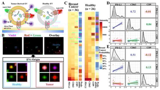 Intelligent probabilistic system for the single EV analysis facilitating the tracing cellular origin. (A) Schematic illustration for the analysis of healthy and tumor EVs, using the single EV analysis. (B) TIRFM images of the mixed EV samples. (C) Phenotyping of the EVs in clinical plasma samples. (D,E) Correlation analysis of the PD−L1, CD63 and CD9 expressions for EVs from clinical cancer plasma samples (D) and healthy plasma samples (E). Reprinted with permission from []. Copyright 2021, American Chemical Society.