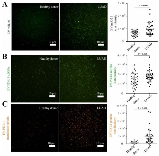 Measurement of the different EV cargo biomarker expressions. Representative images and analysis of the (A) EV miR-21, (B) EV PD-L1 mRNA and (C) EV PD-L1 membrane protein. Reprinted with permission from []. Copyright 2020, American Association for the Advancement of Science.
