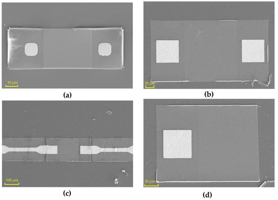When the silicon nanomembrane was prepared, a field emission scanning electron microscope (SEM; SUPRA-55) from ZEISS company (Oberkochen, Germany) was used to characterize the samples. After heavy doping, etching, sputtering, erosion, and other processes, the silicon nanomembrane was ready. Following two transfers, the silicon nanomembrane was successfully transferred to the PDMS flexible substrate. Figure 4 shows the topography of the silicon nanomembranes on the PDMS after the second transfer. Silicon nanomembranes of different sizes were designed on the mask. One size was 100 × 40 μm2, and the side length of the metal area was 12 μm. The actual size of the silicon nanomembrane after the transfer was 95.83 × 34.28 μm2. The side length of the metal region was 10.54 μm, as shown in Figure 4a. Another one of the silicon nanomembranes designed had a size of 300 × 160 μm2, and the side length of the metal area was 60 μm. After the transfer, the measured size was 293.2 × 153 μm2, and the side length of the metal area was 55.57 μm, as shown in Figure 4b. The actual measured size was slightly different from the designed size, which may have been due to a slight deviation in the preparation process, such as during etching. Due to the small size of the silicon nanomembrane, it could not be easily aligned when printing the electrodes. Therefore, continuous silicon nanomembranes were designed with metal strips on both sides in the middle position. The metal strips covered the top of the silicon nanomembrane. When the PDMS transferred the silicon nanomembrane, it also transferred the metal strips attached to it. After the transfer, the metal strips on both sides of the silicon nanomembrane were intact, as shown in Figure 4c. After both of the transfers, some silicon nanomembranes were damaged, as shown in Figure 4d. Only the left half of the silicon nanomembrane was transferred successfully after the two transfers, while the middle of the silicon nanomembrane was fractured in the transfer process, so the right half was lacking. The silicon nanomembranes were not completely removed from the buried oxide layer due to the incomplete corrosion.