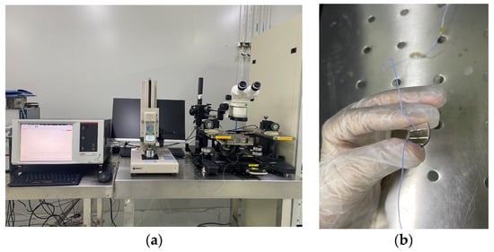 After the silicon nanomembrane was successfully transferred to the PDMS flexible substrate, electrodes were drawn. We used a high-precision micro-nano-material deposition system (Sonoplot Microplotter II) produced by SonoPlot Inc (Middleton, WI, USA). Ag ink was directly printed on flexible substrates using inkjet deposition. To enhance the adhesion between the Ag ink and the PDMS flexible substrate, the PDMS had to be pretreated with oxygen plasma before printing at a power of 300 W for 120 s. Then, the silicon wafer containing the sample was placed on the workbench of the system, and the heating switch of the workbench was turned on in advance, which ensured that the temperature could reach 80 °C before printing and was helpful for curing the Ag ink during the printing process. A needle with a diameter of 10 μm was installed at the designated position, and a small amount of Ag ink was drawn with a dropper and put into a small container for later use. Figure 3a shows an enlarged view of the silver electrodes printed on the PDMS flexible substrate. A needle was moved using the corresponding software operation to determine the position of the silicon nanomembrane on the screen and the coordinates were recorded; then, it was returned to the small container to absorb the Ag ink. The printing was started when the needle reached the edge of the silicon nanomembrane side, as shown in Figure 3b. Electrodes with a size of 5 × 5 mm2 were drawn in advance using the drawing function and printed several times to ensure optimal conductivity. After printing, the silicon wafer was immediately placed on a drying table at 120 °C for 1 h to cure the Ag ink.