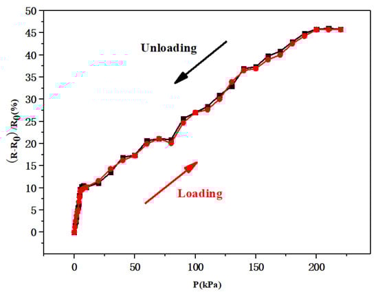 Recoverability is an essential factor that must be considered when evaluating the performance of flexible pressure sensors for practical applications. Figure 7 shows a comparison of the relative resistance variations for the flexible pressure sensor under different loading (red curve, 0–200 kPa) and unloading pressures (black curve, 200–0 kPa). These two curves were approximately the same, indicating that the prepared flexible pressure sensor could quickly recover to the initial state once the applied pressure was released, thus verifying the good recoverability of the sensor.