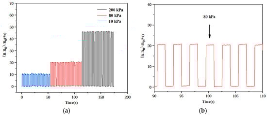 (a) Resistive response of the sensor under different periodic pressures (10, 80, and 200 kPa); (b) the resistive response of the sensor at 80 kPa.