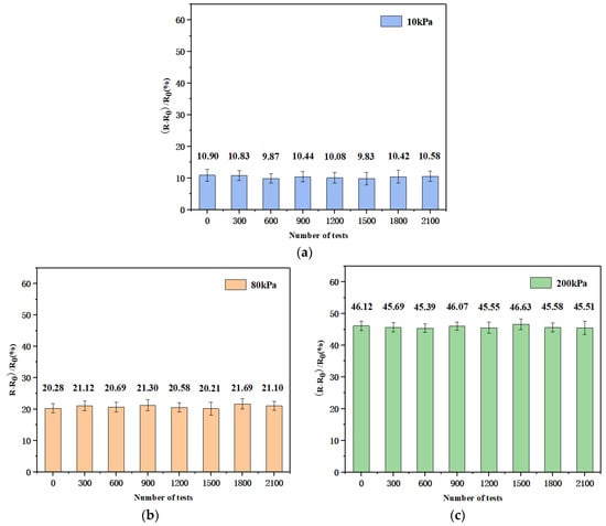 Variation in the relative resistance of the flexible pressure sensor at pressures of 10, 80, and 200 kPa after 0, 300, 600, 900, 1200, 1500, 1800, and 2100 cycles, the error bars represent the standard deviations for the experimental data; (a) variation in the relative resistance of the sensor at 10 kPa; (b) variation in the relative resistance of the sensor at 80 kPa; (c) variation in the relative resistance of the sensor at 200 kPa.