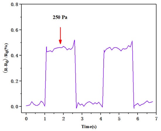 After testing, we found that the minimum detection level of the flexible pressure sensor was 0.1 N, and the corresponding pressure was 250 Pa, as shown in Figure 10. The sensor had a sensitivity of 0.0185 kPa−1 in the pressure range of 0–5 kPa; when the applied pressure was <250 Pa, the resistance of the sensor could not be detected, so the minimum detection limit of this flexible pressure sensor was 250 Pa.