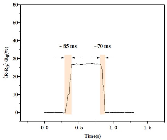 The response time of the sensor is also an important index for evaluating sensor performance. Figure 11 shows the response time of the sensor under external pressure of 100 kPa. The sensor only needed 85 ms after the external pressure was applied to generate a stable waveform, and it required 70 ms to restore the initial state, which also indicated its excellent response time.