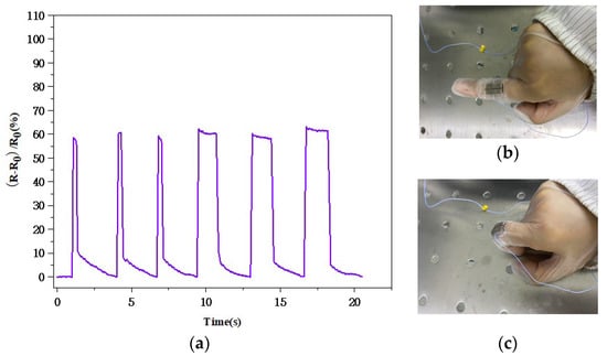 (a) Real-time response graph for the flexible pressure sensor attached to the finger joint; (b) the finger joint in a straight state; (c) the finger joint in a bending state.