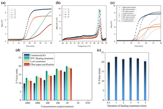 (a) RT-LAMP amplification curves of four different primer sets. (b) Amplicon melting curves of the primer sets. Numbers 1 and 2 represented the primer set designed by our group; 3 and 4 represent the primer set from the work of Huang et al. (c) Comparison of detection sensitivity for the two primer sets with the better amplification performance. The orange curves represent the primer set designed by our group; the dark blue curves represent the primer set from the work of Huang et al. (d) Comparison of three sample treatment methods for spiked frozen shrimp samples with different concentrations of SARS-CoV-2. (e) Influence of different heating times for RT-LAMP reaction with spiked shrimp samples.