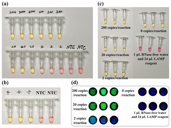(a) Results of colorimetric RT-LAMP for different concentrations of SARS-CoV-2. (b) Results of colorimetric RT-LAMP for MS2 phage. (c) Results of dual colorimetric RT-LAMP for SARS-CoV-2 and MS2 phage. (d) Fluorescence visualized results of CRISPR reaction.