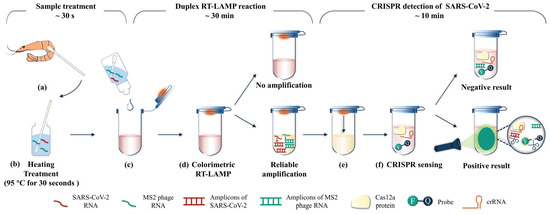 A schematic of the sensitive and reliable detection method for SARS-CoV-2 on spiked shrimp samples. (a) Sampling from the surface of shrimp. (b) Heating treatment for swab sample. (c) Adding one drop of target sample as amplification template. (d) Carrying out LAMP reaction at 65 °C. An additional heating step at 37 °C for 10 min will be included before amplification if there is amplicon contamination. (e) Mixing the CRISPR reagent which pre-added inside the tube lid with LAMP amplicons. (f) Carrying out CRISPR reaction at 37 °C for 10 min and observing the fluorescence results with an ultraviolet lamp.