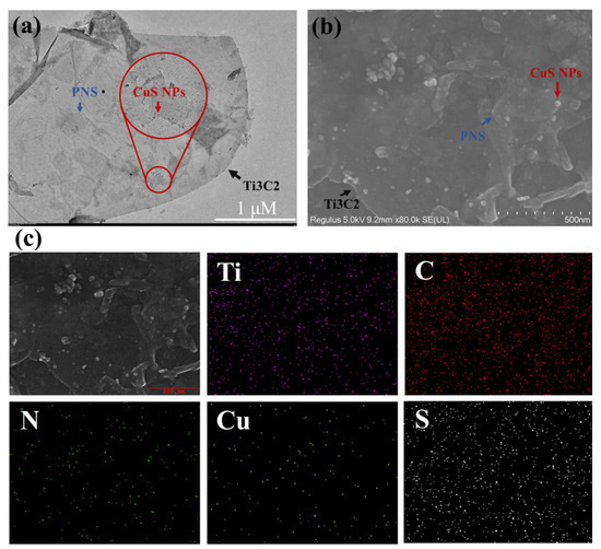Characterizations of CuS-PNSs/Ti3C2 nanohybrids: (a) TEM image; (b) SEM image; (c) SEM-based elemental mapping.