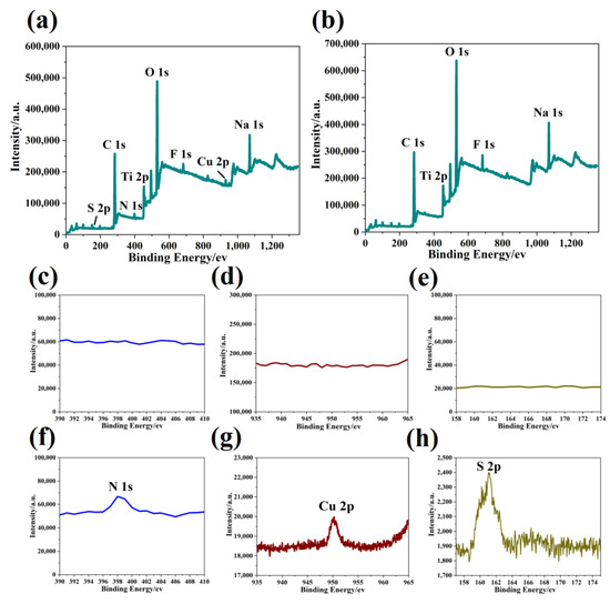 XPS characterization of CuS-PNS/Ti3C2 nanohybrids: (a) XPS survey spectrum of CuS-PNSs/Ti3C2; (b) XPS spectrum of Ti3C2; (c–e) XPS spectra of N, Cu, and S in Ti3C2; (f–h) XPS spectra of N, Cu, and S in the CuS-PNSs/Ti3C2 nanohybrids.