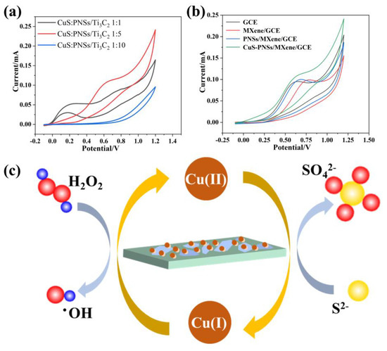 Electrochemical tests of different GCEs. (a) CV curves of different ratios of CuS and PNSs/Ti3C2 in the H2O2 concentration of 5mM; (b) CV curves of GCE, Ti3C2/GCE, PNSs/Ti3C2/GCE, and CuS-PNSs/Ti3C2/GCE; (c) electrochemical oxidization–reduction reaction mechanism by CuS NPs.