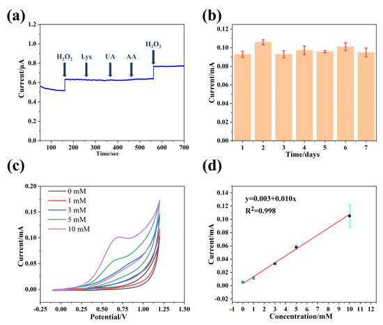 As shown in Figure 6a, when lysine, UA, and AA were added successively during the test, the I–T curve does not reveal an obvious current response; but when H2O2 is added again, the current intensity shows a very obvious current response. Therefore, it can be concluded that the CuS-PNSs/Ti3C2 hybrid material-based electrochemical biosensor has good anti-interference ability. Furthermore, to test the stability of the material, CuS-PNSs/Ti3C2/GCE was stored at −4 °C for 7 days, and the electrochemical detection ability of CuS-PNSs/Ti3C2/GCE for H2O2 was tested once every day. After seven days of testing, it was found that the electrochemical performance of the material was basically the same (Figure 6b), which indicates that the CuS-PNSs/Ti3C2/GCE has good stability and can still maintain an extremely high detection performance after long-term storage. At the same time, the actual sample was tested. H2O2 was added to the milk to prepare different concentrations of H2O2 milk solution to simulate the actual sample. In Figure 6c, it can be seen that the current response at 0.6–0.8 V increases with the increase in H2O2 concentration in milk, indicating that the CuS-PNSs/Ti3C2-based electrochemical biosensor also has good detection performance in reagent samples. In Figure 6d, it can be seen that the CuS-PNSs/Ti3C2-based electrochemical biosensor has a good linear relationship with the detection of real samples, and it can be utilized as a reliable electrochemical detection platform for determining H2O2.