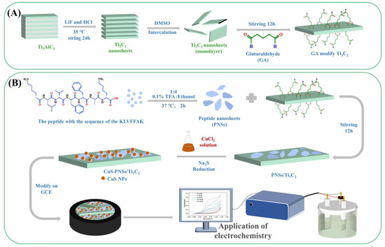 In this work, GA is used as a cross-linking agent to connect Ti3C2 with self-assembled peptide nanosheets (PNSs) to enrich the Ti3C2 surface groups. The peptide with the sequence KLVFFAK is selected to modify the Ti3C2 surface for this aim. The peptide sequence KLVFFAK is derived from a partial fragment of β-amyloid and is able to form nanosheets of moderate thickness and size through π–π interactions [26,27,28]. By modulating the self-assembly of KLVFFAK peptides, smaller size PNSs are prepared and modified onto the Ti3C2 surface by GA-based cross-linking, which leads to an increase in the type and number of groups on the Ti3C2 surface. At the same time, the isoelectric point of the KLVFFAK peptide is 10.6, and the PNSs formed by the peptide self-assembly under neutral and acidic environments have a negative charge, which enhances the electronegativity of Ti3C2 after the modification and facilitates the subsequent binding with metal ions. CuS nanoparticles (NPs) were selected to improve the catalytic performance of PNSs/Ti3C2 hybrid materials. As a common metal, copper ion has good electrical conductivity and catalytic performance. It has been widely used in electrochemical sensors, carbon enrichment products, and hydrogen evolution reactions [29,30]. Additionally, sulfides are important semiconductor materials due to their metal-like properties for chemical sensing, and it should be noted that there is an additional advantage of cost-effectiveness of copper sulfide due to its Earth abundant property [31,32].