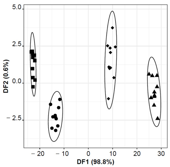 E-nose-MOS-LDA-SA model’s discrimination of the four studied Gram-positive and Gram-negative bacteria grown in BHI agar medium: (▲) E. faecalis; (♦) S. aureus; (■) E. coli; and, (●) P. aeruginosa. Classification model based on 25 feature extraction MOS signal parameters (S6_LP, S1_INT, S5_INT, S8_INT, S9_INT, S1_MAX, S2_MAX, S4_MAX, S6_MAX, S2_MIN, S4_MIN, S5_MIN, S6_MIN, S2_SUM, S3_SUM, S5_SUM, S6_SUM, S8_SUM, S9_SUM, S2_MEAN, S5_MEAN, S1_SD, S2_SD, S3_SD, and S6_SD).