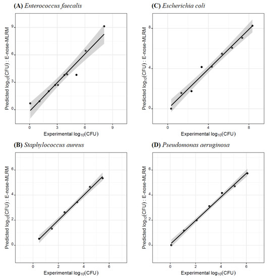 As previously mentioned, few studies report the use of E-noses as semi-quantitative [23,26] or quantitative [27,28] tools to assess the levels of bacteria. In this sense, the present study also aimed to evaluate the quantitative performance of the lab-made E-nose-MOS for determining the number of each type of bacterium (i.e., CFUs) in the BHI agar medium. For that, MLRM were developed relating the decimal logarithmic of the CFUs (log10(CFU)) of each one of the four bacteria as a multiple linear function of the selected feature extracted parameters derived from the E-nose-MOS response towards the VOCs emitted by every single bacterium grown in solid medium. The predictive models’ performances were evaluated based on two goodness of fitting parameters (R2 and RMSE) for the LOO-CV variant. Table 3 shows the goodness of fitting data as well as the information regarding the concentration range studied and the number of parameters included in each developed MLRM, which were selected by the SA algorithm.