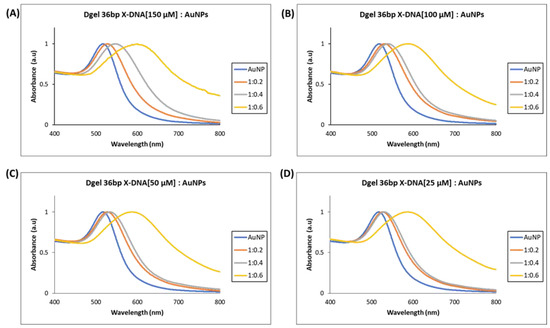UV visible spectrum analysis of Dgel fabrication with the variations in the concentration of 56 bp X-DNAs, whereas AuNPs concentration and ratios, were constant, respectively. (A) Dgel (56 bp X-DNA [150 µM]:AuNPs) (B) Dgel (56 bp X-DNA [100 µM]:AuNPs) (C) Dgel (56 bp X-DNA [50 µM]:AuNPs) (D) Dgel (56 bp X-DNA [25 µM] AuNPs).