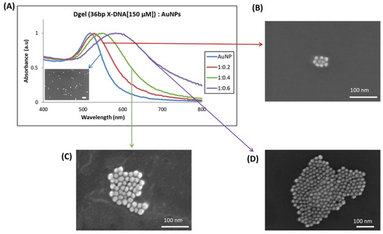 The UV visible analysis ascertained the electrostatic attraction felicitated nano assembly of Dgel:AuNPs. UV visible studies were executed to understand the tuning of plasmonic properties in AuNPs. In earlier reported studies, size, and shape-dependent tuning of surface plasmonic properties were carried out with different methods [24,25]. In this study, we have performed electrostatic force-driven convenient nano assembly of Dgel:AuNPs causing a plasmon shift from UV vis to near-infrared wavelength. The molar ratio calibrated Dgel:AuNPs nano assembly influenced the plasmonic properties of AuNPs. The nano assemblies of Dgel:AuNPs were assayed with alteration in molar ratios as Dgel [36 bp X-DNA]:AuNPs with 1:0.2, 1:0.4, and 1:0.6 at different concentrations of engineered Dgel each. The observed UV-visible studies demonstrate the evident and gradient plasmonic redshifts (Figure 3). We utilized the Dgel engineered for further assembly stages with variable concentrations of 36 bp X-DNAs (25, 50, 100, and 150 µM). The dielectric properties of the material and the frequency of the dipole resonance depend upon the size and shape of the nanoparticles [26]. Correspondingly, at a higher concentration of 150 µM Dgel:AuNP assembly showed the plasmonic absorption spectrum redshifted to 603 nm wavelength at a mixing ratio of Dgel [36 bp X-DNA]:AuNPs 1:0.6 (Figure 3A). Likewise, at 100 and 50 µM (Figure 3B,C) with similar mixing ratios of Dgel [36 bp X-DNA]:AuNPs, the gradient redshift happened. Referring to Figure 3, the redshifts were gradual, while in the low-concentration instances, the shifts dependent on molar ratios were drastically moved (Figure S1). In the instance of 25 µM concentration-based Dgel scaffold assembly of AuNPs, the plasmonic peak shifted moderately from 516 up to 587 nm (Figure 3D). The plasmonic shift changed drastically near to infrared along with the change in molar ratios as Dgel [36 bp X-DNA]:AuNPs with 1:0.4, (532 nm), and 1:0.6 shifted to 587 nm. The plasmonic absorption’s redshift exhibits the spectrum shift with an extended tail to the near-infrared region. Similarly, scanning electron microscope (SEM) image analysis constitutes the formation of Dgel:AuNPs nano assemblies with varied molar ratios (Figure S2). The successful demonstration of the Dgel [36 bp X-DNA]:AuNPs assemblies and plasmonic redshift allowed us to investigate the assembly of gold nanoparticles under various conditions, especially, the variable Dgel scaffold sizes with variable molar ratios of the Dgel [56 bp X-DNA]:AuNPs and Dgel [76 bp X-DNA]:AuNPs.