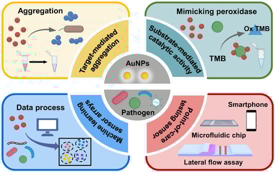 Gold nanoparticles (AuNPs), an intensively investigated nanomaterial, have been widely employed in biosensing, drug delivery, disease diagnosis, biolabeling, and other exciting fields due to their unique physical properties [,,]. The size of AuNPs is approximately 1–100 nm, and they are usually colloidal when dispersed in an aqueous solution. Functionalized AuNPs have excellent stability and biocompatibility, which makes them suitable for analyte detection in complex biological systems. As a sensing unit, the intrinsic properties of AuNPs provide several advantages for the construction of colorimetric sensor [,]. Firstly, the most attractive aspect is that AuNPs exhibit strong surface absorption characteristics []. When the free electrons on the surface of AuNPs are excited by incident light, a surface plasmon resonance effect is generated. A characteristic resonance peak can be displayed in the ultraviolet–visible light region. The emergence of AuNPs can be regarded as a milestone in the construction of a colorimetric sensor []. Secondly, the synthesis and functionalization of AuNPs are very easy. By regulation of the morphology of AuNPs, the distance between particles, and the refractive index of surrounding media, AuNPs with different colors can be obtained easily. Due to their large surface-to-volume ratio, AuNPs can be easily functionalized by various ligands such as antibodies, peptides, aptamers, and other small biomolecules, which endows them with the ability to recognize analytes. Thirdly, AuNPs also exhibit excellent fluorescence-quenching performance and outstanding catalytic ability of the mimic enzyme. As an efficient fluorescence quencher, AuNPs have been widely utilized to construct Forster resonance-energy transfer (FRET) [] and nanometal surface-energy transfer (NSET) systems [] for highly sensitive detection of analytes. Forth, AuNPs have outstanding peroxidase-like catalysis activity. A colorimetric sensor based on the intrinsic peroxidase-like activity of AuNPs is realized by catalyzing the oxidation of chromogenic substrates such as 3,3,5,5-tetramethylbenzidine (TMB) []. Finally, colorimetric sensors based on AuNPs can be combined with the latest detection techniques, and advanced machine learning algorithms further significantly enhance the detection performance []. Hence, colorimetric sensors based on functionalized AuNPs have attracted growing interest in the field of biosensing [,,]. Based on the corresponding color change of AuNPs as the analytical signal, these colorimetric biosensors have been employed for various types of pathogen detection [,,]. In comparison to traditional pathogen detection methods, AuNPs-based sensor arrays have the characteristics of easy readout, portability, and cost-efficiency, providing potential ability for rapid and accurate point-of-care tests of pathogens. Therefore, a timely and comprehensive summary of this research field is essential.