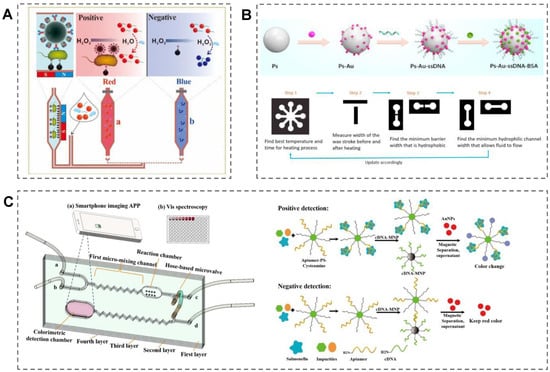 A microfluidic chip integrates various types of units and offers advantages such as a miniaturized analytical platform, high throughput, shortened detection time, and low sample consumption []. Significantly, the combination of AuNPs with a microfluidic chip can further improve the performance of detection system []. Considering the above advantages, microfluidic chips based on the opticality of AuNPs have been frequently reported for pathogen detection in recent years []. For instance, Lin et al. constructed a colorimetric microfluidic chip for E. coli O157:H7 detection based on the color change by the aggregation of the AuNPs []. A smartphone was used to record the color change of the sensing system. The magnetic nanoparticles were functionalized by the capture antibodies, and the polystyrene microspheres were modified by the detection antibodies (Figure 5A). In the first mixing channel of the microfluidic chip, a magnetic-nanoparticle–E. coli–polystyrene complex was formed and captured in the separation chamber. After the addition of hydrogen peroxide into the complex, the AuNPs and the crosslinking agents reacted with the catalyst in the second mixing channel. Aggregation of the AuNPs was induced by the crosslinking of phenolic hydroxyl moieties and led to the system’s color changing from blue to red. The detection limit of this system for E. coli O157:H7 was 50 CFU/mL. Recently, Stanciu et al. presented a paper-based microfluidic device for the simultaneous detection of E. coli O157:H7 and S. Typhimurium with the quantification of the colorimetric signal []. Paper-based microfluidic devices are rapid, versatile, and low-cost. In this work, aptamer–AuNPs were decorated on the surface of polystyrene microparticles to enhance the stability and sensitivity of the colorimetric system (Figure 5B). The color intensity obtained by the image analysis equipment could be converted into the concentration of the analyte to achieve quantitative analysis. The LODs for E. coli O157:H7 and S. Typhimurium were 103 CFU/mL and 102 CFU/mL, respectively. In another study, Pan et al. presented a colorimetric microfluidic biosensor based on thiolated polystyrene microspheres (SH-PSs), which induced the aggregation of AuNPs for S. typhimurium detection []. The aptamer-functionalized PS–cysteamine conjugates were employed to react with bacteria, and the complementary-DNA-modified-magnetic-nanoparticle complex was used as the capture probe (Figure 5C). Upon the addition of S. typhimurium to the system, AuNPs aggregated on the surface of bacteria–aptamer–PS–cysteamine conjugates, causing the detection chamber to change color from red to blue. The microfluidic device displayed a reasonable specificity with an LOD of 6.0 × 101 CFU/mL. To further improve the detection performance of the system, it is an excellent strategy to combine a DNA logic system with microfluidic technology [].