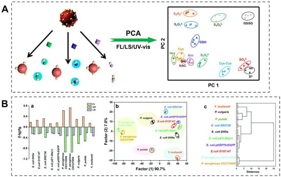 An unsupervised learning algorithm has two primary functions in data analysis. The first is dimensionality reduction for extracting the representative characteristics from the high-dimensional data. The second is clustering analysis of data based on the pair-likeness measure. Standard unsupervised learning algorithms in data analysis include principal component analysis (PCA) [], hierarchical cluster analysis (HCA), T-distributed stochastic neighbor embedding (T-SNE), and uniform manifold approximation and projection (UMAP) []. We first introduce the application of PCA in array-based sensors for bacteria identification. Recently, Yang et al. employed a AuNPs–Gold/silver nanocluster (AuAgNC) composite as the sensor unit to construct a three-dimensional sensor array for sulfur-containing species and bacteria discrimination []. The negatively charged AuAgNCs were bound to the surface of AuNPs by electrostatic interaction. The target analyte could induce the separation of AuAgNCs from AuNPs by the coordination interactions between sulfur-containing species and the surface ligand of AuAgNCs. (Figure 6A). Various target bacteria exhibited diverse affinities towards AuAgNCs due to their different surface microenvironments, leading to the color change of the solution. With the assistance of PCA, the obtained optical signals, including the fluorescence, UV–vis signal, and light scattering, could be reduced into a 2D plot. Five types of bacteria, including three sulfur-oxidizing bacteria and two common pathogens, could be well discriminated at a concentration of OD600 = 0.005. The HCA method can be used for visual analysis of analytes based on the similarity between distinct categories of data points. In another similar study, vancomycin-modified AuNCs (Van–AuNCs) and cetyltrimethylammonium-bromide-functionalized gold nanoparticles (CTAB–AuNPs) were selected as the optical probes to construct a sensor array for Gram-negative bacteria identification []. The recognition mechanism was based on the specific interaction between the vancomycin on the surface of AuNCs and the bacterial cell wall. In addition, the electrostatic interaction between the CTAB–AuNPs and bacteria also played an important role in bacterial identification. The negatively charged AuNCs could be absorbed on the surface of AuNPs to form a novel nanocomposite by electrostatic interaction. In the presence of target bacteria, three types of optical signals (fluorescence, UV–vis absorbance, and light scattering) were simultaneously changed due to the interaction between the bacteria and the nanocomposite. As shown in Figure 6B, ten types of Gram-negative bacteria at OD600 = 0.015 could be accurately identified by HCA based on the similarity of the different bacteria strains. Significantly, the sensing system accurately discriminated five subtypes of E. coli, including three types of antibiotic-resistant E. coli and two non-resistant E. coli strains. This study demonstrated that HCA can be used to evaluate the similarity of characteristics among diverse strains. As two emerging dimensionality reduction techniques, T-SNE and UMAP have more powerful functions in dealing with nonlinear problem. Unfortunately, these two methods are rarely utilized in colorimetric sensor arrays.