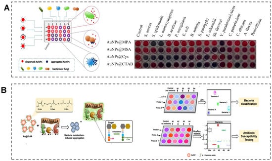 Currently, sensor arrays have attracted much attention in pathogen detection due to their excellent sensitivity, simultaneous detection of multiple analytes, and easy operation []. The key to constructing a sensor array is the design and preparation of the sensor unit. Functionalized AuNPs are widely utilized in sensor arrays because of their excellent optical properties []. By modifying the surface of AuNPs, they can be endowed with the ability of target recognition []. AuNPs have been used to detect and kill bacteria, but it is still challenging to realize specific bacterial identification []. Currently, methods of targeting bacteria mainly rely on cationic polymers, antibodies, and carbohydrates []. In this section, we review the interaction mechanism between the functionalized AuNPs and the bacteria.