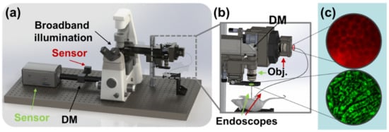 - Bae, Y.S.; Kim, J.Y.; Kim, J.K. Attachable Micro-Endoscopy System to Conventional Microscope for Live Mouse Organ Imaging Using 4f Configuration. In Optics and Laser Technology, Proceedings of the 5th International Conference on Photonics, Porto, Portugal, 1–27 February 2017; SCITEPRESS—Science and Technology Publications: Setúbal, Portugal, 2017; pp. 137–140. [Google Scholar]