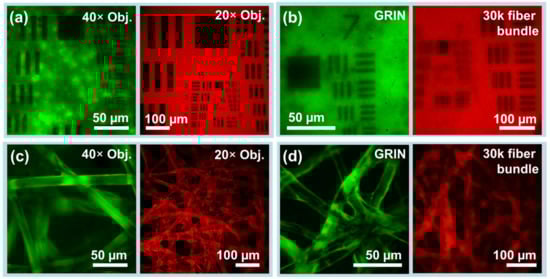 The practical field of view (FOV) of the system in each channel is limited by the objectives used as well as by the endoscopes used. Practical fields of view are shown in Figure 4, and summarized quantitatively as follows. As measured along the edge of the square frame, the 40× objective on the green channel achieved a FOV of 186 µm, while the 20× objective on the red channel achieved a FOV of 643 µm. For GRIN lenses and fiber bundles, fields of view measured 133 µm and 364 µm, respectively.