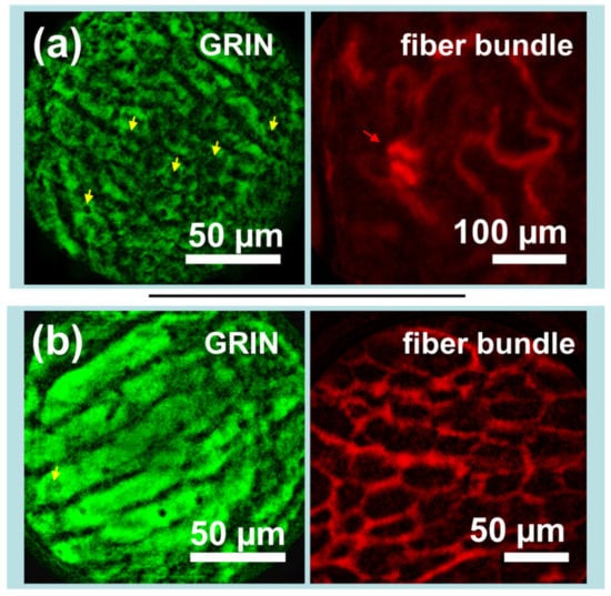 - Kim, J.K.; Lee, W.M.; Kim, P.; Choi, M.; Jung, K.; Kim, S.; Yun, S.H. Fabrication and Operation of GRIN Probes for In Vivo Fluorescence Cellular Imaging of Internal Organs in Small Animals. Nat. Protoc. 2012, 7, 1456–1469. [Google Scholar] [CrossRef]