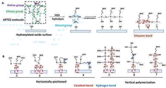 (A) Schematic representation of an APTES molecule, activation, and reaction with the hydroxylated oxide surface in an ideal situation. (B) Chemical interactions involved in APTES grafting on the hydroxylated oxide surface.