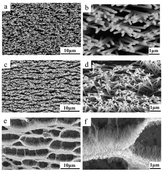 SEM images of the substrate surface with NWs of 200 (a,b), 100 (c,d), and 60 nm (e,f) diameter and 10 µm length.