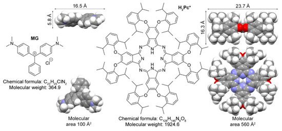 Compounds studied in the present work–malachite green dye, MG; and octa (2,6-diisopropylphenoxy) phthalocyanine, H2Pc*. Molecular sizes are based on space-filling models obtained by geometrical optimization at the BP86/def2-SVP level of theory (only triphenylmethyl cation was optimized in the case of MG).