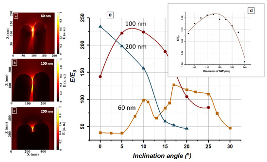 (a–c) Electric field enhancement (E/E0) in the area between leaning NW tips: (a) nanowire diameter of 60 nm, tilt angle of 20 degrees; (b) nanowire diameter of 100 nm, tilt angle of 10 degrees; (c) nanowire diameter of 200 nm, tilt angle of 10 degrees; (d) The dependence of the electric field enhancement on the nanowire diameter (excitation is under the 532 nm CW laser); (e) Dependence of the maximum local field enhancement (E/E0) in the area between leaning NW tips on the tilt angle.