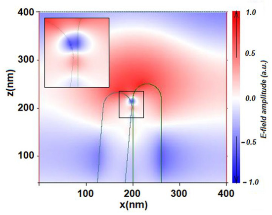 Numerical calculations of the enhancement of the local electromagnetic fields near the gap between two Ag-NW tips were performed using the electromagnetic KARAT code in planar geometry (X, Z) with a monochromatic incident laser wavelength of 532 nm [75]. The Drude model was used, taking parameters for silver: a plasma frequency of 8.78 eV and a damping constant of 0.02 eV.