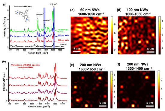 (a) Raman spectrum of 0.27 mM MG solution multiplied by 10, then SERS spectra of 0.27 µM MG solution on substrates with NWs with a diameter 200 nm, 100 nm and 60 nm. (b) SERS spectra recorded from different parts of the substrate with 60 nm diameter NWs. (c–e) SERS-mapping of substrates with NWs with a diameter of 60, 100, and 200 nm, which was plotted from the area under the peak located at 1616 cm−1. (f) SERS-mapping of substrates with an NW of diameter 200 nm, which was plotted from the area under the peak located at 1365 cm−1.
