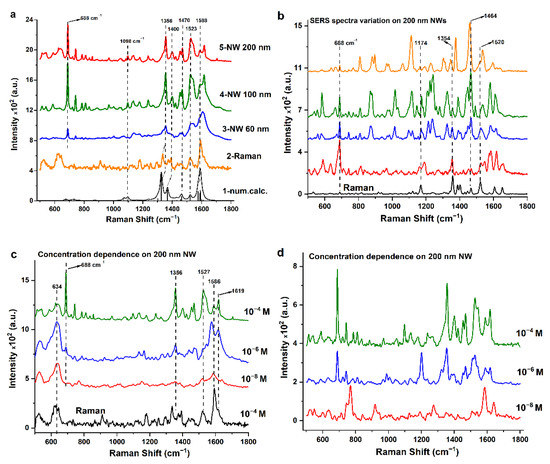 SERS spectra of MG molecules adsorbed on substrates with an array of NWs with a diameter of 60, 10, and 200 nm are shown in Figure 5a. The strongest SERS peaks were found at 1589, 1616 and 1177 cm−1. The first two are assigned to combinations of the C=C stretching vibrations of the phenyl ring, and the first one is the C-H bending mode of the phenyl ring. The other peaks at 434, 530, 802, 916, 1290, 1363 and 1487 (combination of the C=C stretching motions of the aromatic ring), are also present in the spectrum, which agrees with other experimental and theoretical studies [69,77,78,79]. Comparison of the obtained SERS spectra of the MG solution at a concentration of 27 µM with the Raman spectrum of MG at a higher concentration of 0.27 mM (Figure 3a) shows that the SERS signal intensity increases with a decrease in the NW diameter. The most efficient substrates are those with NWs 60 nm in diameter (Figure 5a). This can be explained by the feature of the hot-spot formation by NWs of different diameters. Due to the small size of MG molecules, the size of the enhancing area of the substrate will play the main role in getting the most intense SERS spectra.