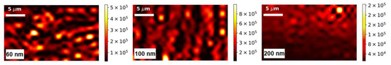 Figure 8 shows the Raman spectral maps of H2Pc* molecules on SERS substrates with different NW diameters plotted over the full area under the spectra from 500 to 1800 cm−1. It can be clearly seen that the structure of the area distribution perfectly fits the mapping over integral intensity (the area) under characteristic Raman peaks. This proves the theory about the existence of hot spots in the area between NW tips, because these SERS maps prove that the greatest amplification of the SERS spectrum and the associated concentration of electrical fields is on the NW. Since the focal point in SERS spectroscopy is larger than the size of the hot spot, we cannot say that there are point gaps between the NW tips, but we may say that the presence of hot spots in the place of leaning NW is indisputable. For large molecules, unlike small ones, their orientation relative to hot spots (angular dependencies) is extremely important. In this case, an important role is played by the angles at which neighboring NWs stick together.