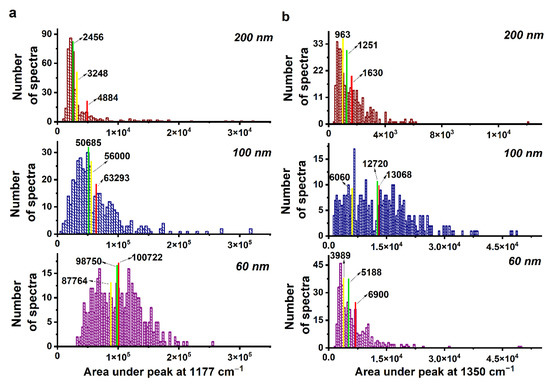 The quality of SERS-active surfaces can also be assessed using characteristic histograms. Figure 9a shows the distribution histograms of the area value of the MG SERS peak located at 1177 cm−1. The green line is the histogram median, and the red line is the mean value, where the median is the middle of the set of numbers and the mean value is the average of a data set. With a decrease in the NW diameter, the median of the histogram shifts to the region of large area values which indicates that, for a larger number of sample spectra (400 spectra in total), the area under the peak takes on higher values compared to the spectra of MG molecules adsorbed at NWs 200 nm in diameter. In addition, the relative shift of the mean value relative to the median of the diagram is nearly 50%, 20%, and 2% for NWs 200 nm, 100 nm, and 60 nm in diameter, respectively (see Table 1).