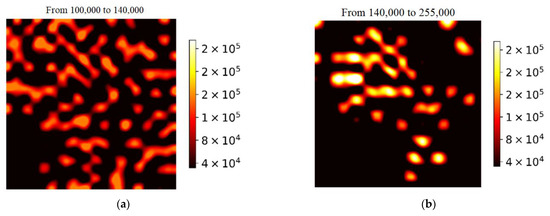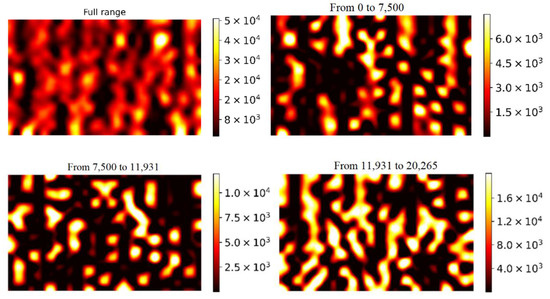 Let us consider in more detail the intensity-distribution histogram for MG molecules adsorbed on the SERS substrate with 60 nm diameter NWs. In addition to the first peak on the histogram, which characterizes the SERS signals close to the spectral noise, two enhancement ranges can be distinguished: 1.05–1.45 and 1.45–2.55. SERS-mapping images were plotted for these enhancement ranges, and there is a significant difference between them (Figure 10). Image analysis suggests that these areas correspond to different mechanisms of SERS amplification. The areas of the greatest enhancement correspond to hot spots of the gap type, which appear when the tips of two or more NWs lean toward each other at certain angles. They correspond to the horizontal stripes in the SERS-mapping image. The image shows that similar horizontal stripes appear when two adjacent NWs are leaning to each other by its tips (Figure 1c). The region of moderate enhancement corresponds to tip hot spots that appear at the NW tips. The conditions for their occurrence are simpler, and, therefore, the total area of such type of amplification region is larger than for hot spots of the gap type.